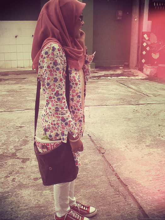 jilbab... jilbab lama sih, cuma dulu aku nganggepnya norak, soalnya ada bunga"nya -_- trus makin kesini malah makin nge-trend jilbab bermotif. yaudah, dari pada oblong jilbabnya, aku pake jilbab motif bunga. trus agak dimainin dibagian atas biar ga monoton. dan menghasilkan sebuah untaian kecil dibagian depan. aha.